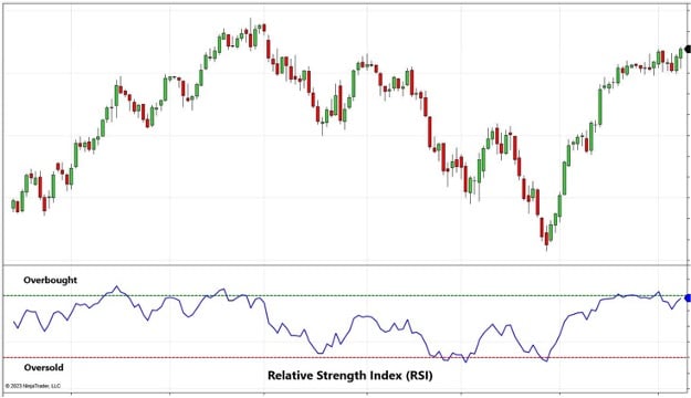The most common momentum indicator used by futures traders is the Relative Strength Index or RSI. This indicator compares the strength of moves on up bars vs. down bars. The speed and strength of this price action results in the trader’s ability to determine if a futures market is overbought or oversold.